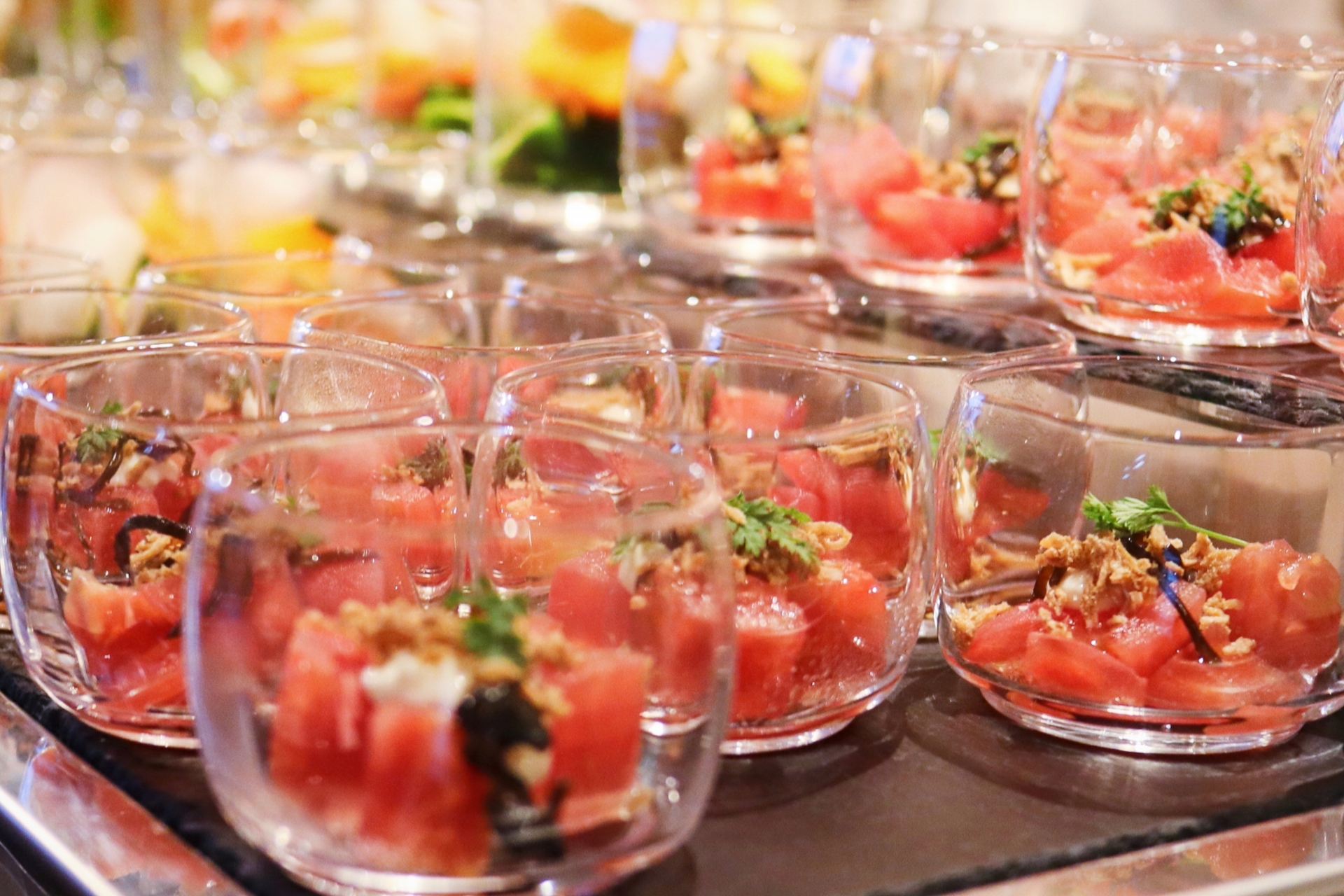 ビュッフェの締めくくりを華やかに飾るデザートタイム。 定番のデザートビュッフェに加えて、最近は「キャンディビュッフェ」も人気を集めています。 カラフルなキャンディやチョコレートを、ゲスト自身で選んでボトルに詰めてもらう演出は、見た目にも楽しく、会話も弾みます。